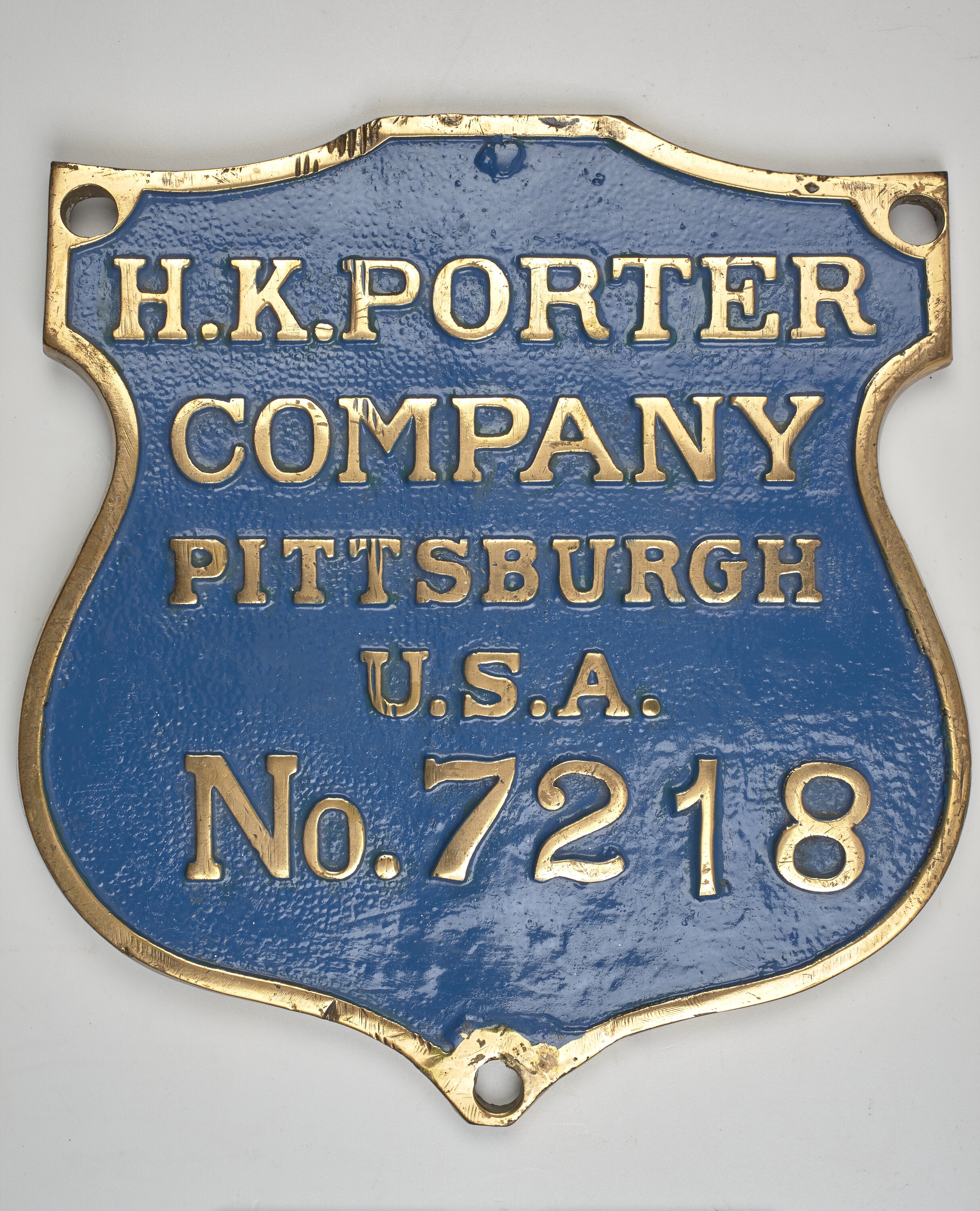 Brass shield shapped locomotive builders plate, No. 7218, manufactured by H.K. Porter Co., Pittsburgh, Pennsylvania, USA, circa 1926-1943.