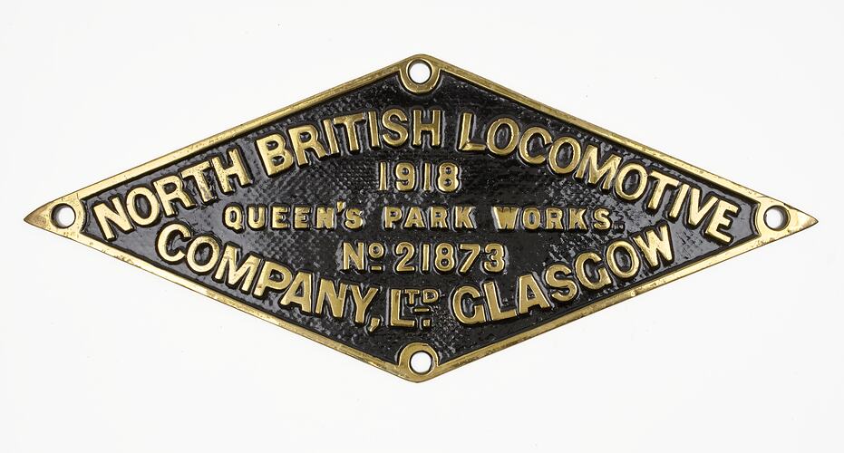 Brass diamond shaped locomotive builders plate, No. 21873, manufactured by North British Locomotive Co., Queen's Park Works, Glasgow, Scotland, 1918.