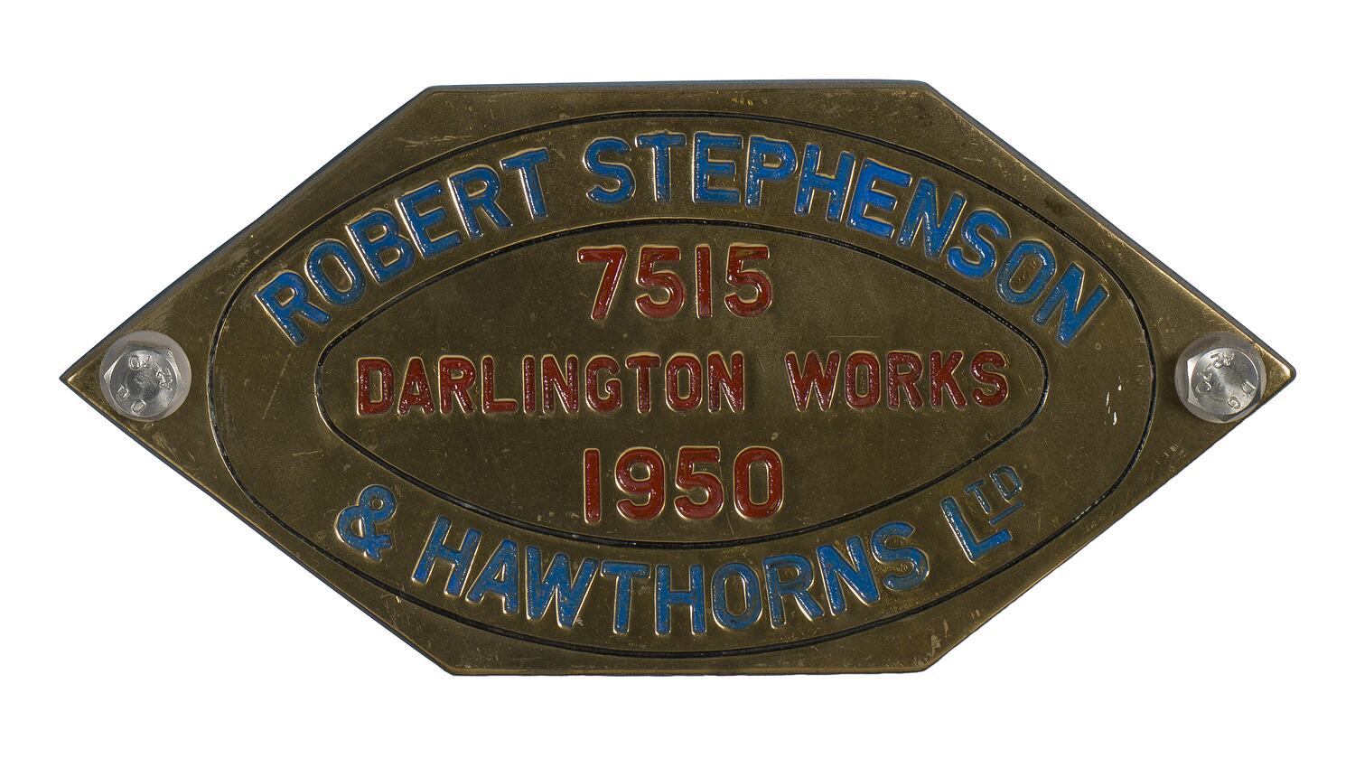 Brass hexagonal locomotive builders plate, No. 7515, manufactured by Robert Stephenson & Hawthorns Ltd, Darlington, England, 1950.