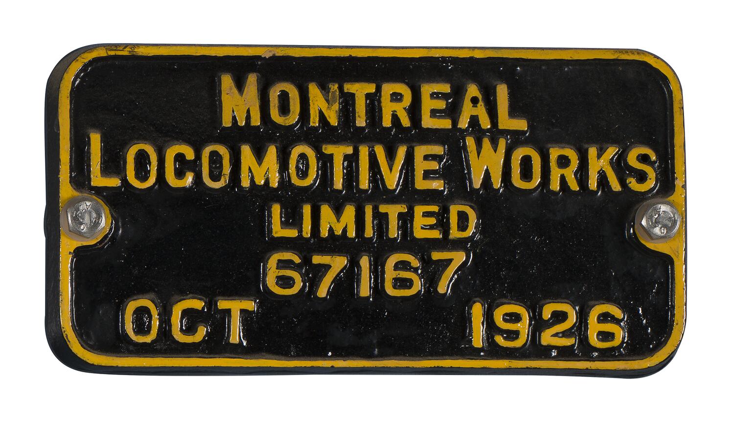 Cast iron rectangular locomotive builders plate, No. 67167, manufactured by Montreal Locomotive Works Limited, Montreal, Canada,October 1926.