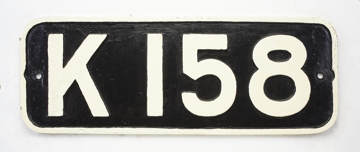 Locomotive number plate K Class, number 158, from a Victorian Railways, 2-8-0 branch line steam locomotive. The K class was built at the Newport Workshops of Victorian Railways, 1922-45.
