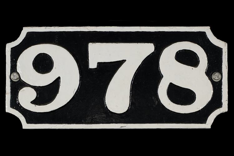 Locomotive number plate A2 Class, number 978, from a Victorian Railways, 4-6-0 express passenger steam locomotive. The A2 class was built at the Newport Workshops of Victorian Railways, 1907-1922.