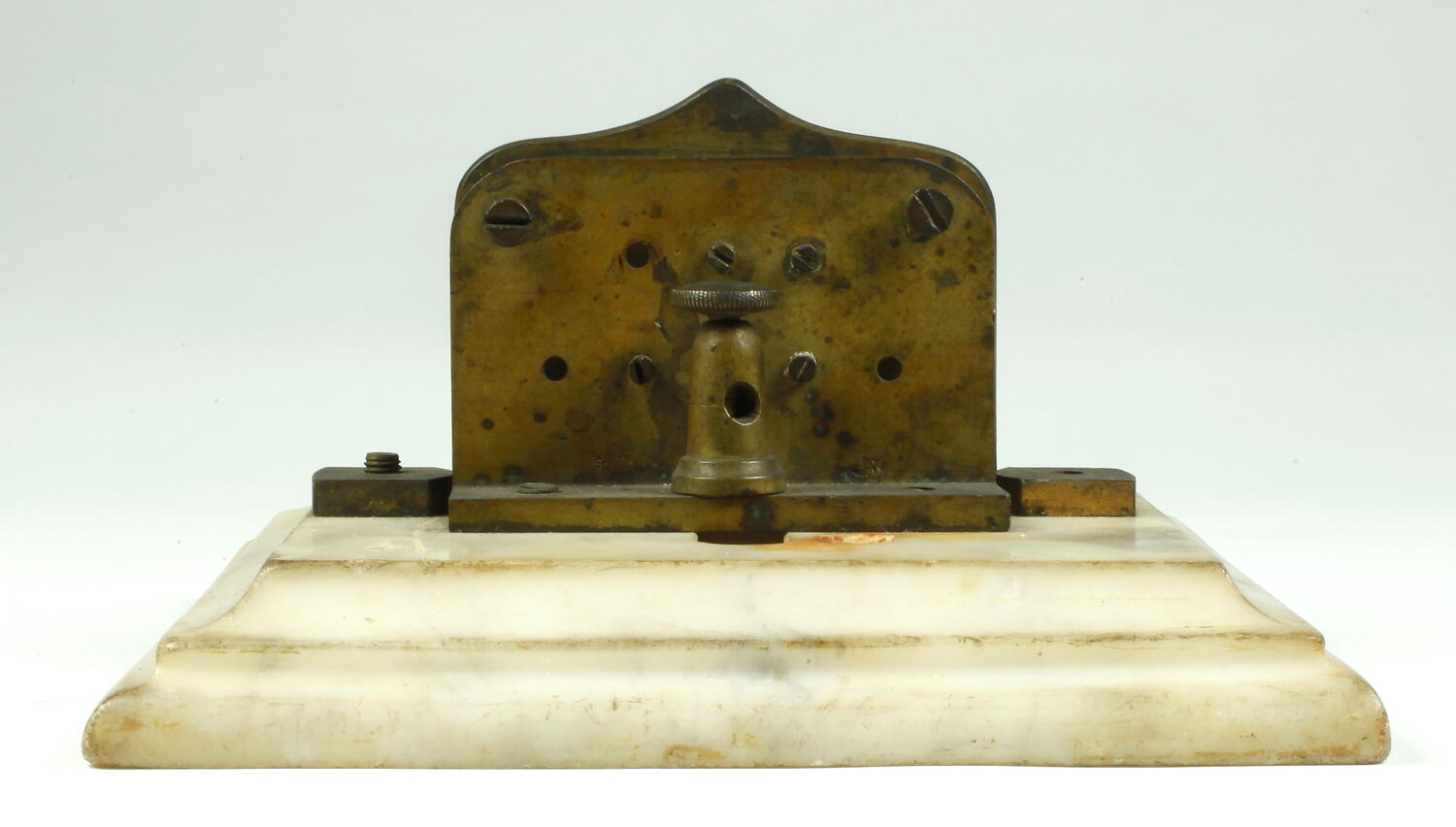 Three vertical brass plates on a marble base. The two outer plates are fitted with sets of points directed towards but not touching the centre plate. Brass fittings and terminals.