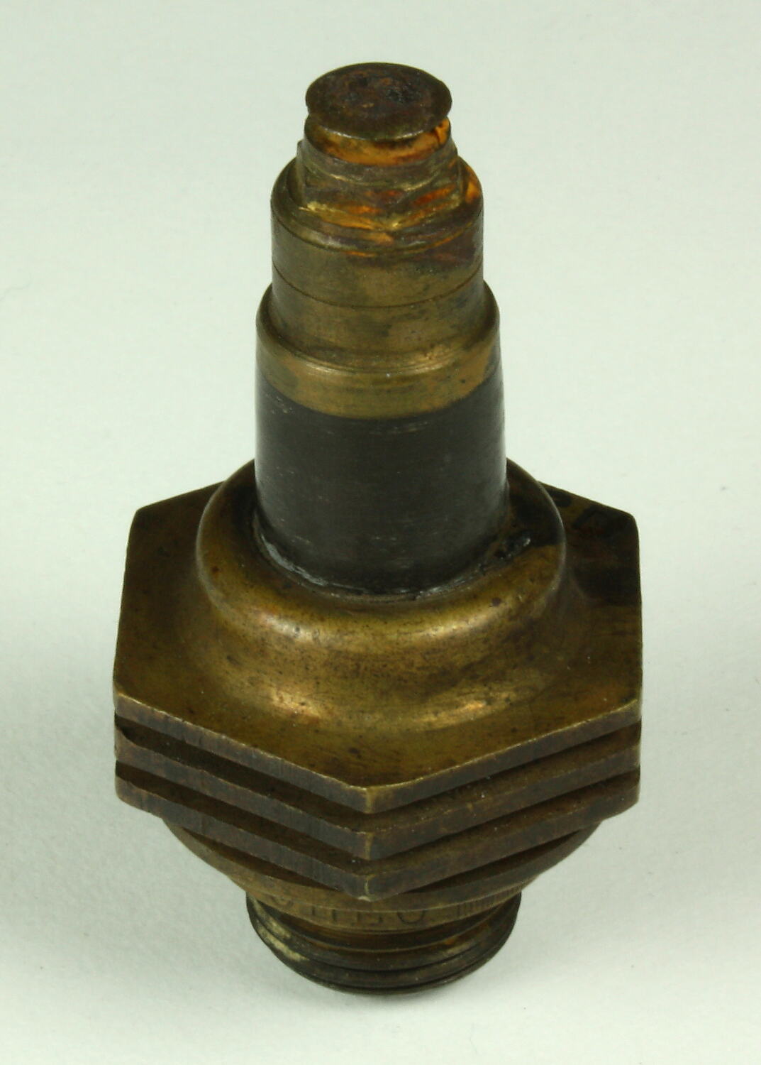 Brass body with three hexagonal cooling fins and insulation built up of discs of mica. Plate with holes round central sparking point were designed to protect the insulation from dust and dirt.