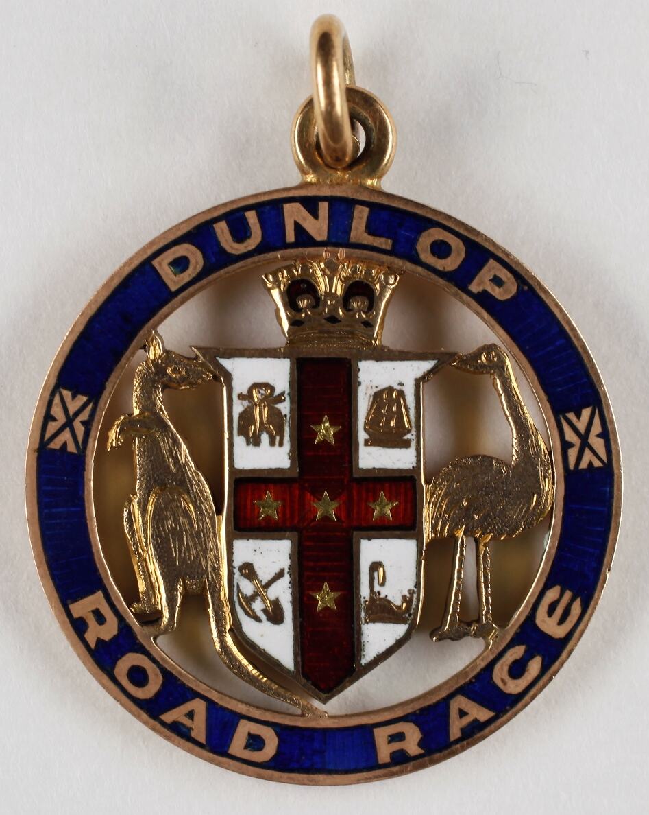 Cycling award won by Hubert Opperman, 1926. Dunlop Rubber Co. Warrnambool to Melbourne. Fastest time - 7 hrs. 36 mins. 10 secs. Blue on gold with coat of arms.