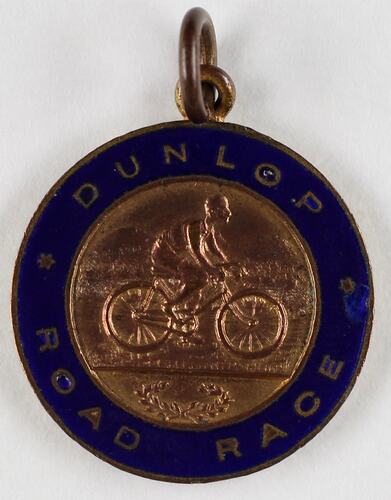 Cycling award for Sir Hubert Opperman, 1926. Dunlop - Warrnambool to Melbourne Road Race. Fastest time - 7 hours, 36 minutes, 10 seconds. Blue on gold.