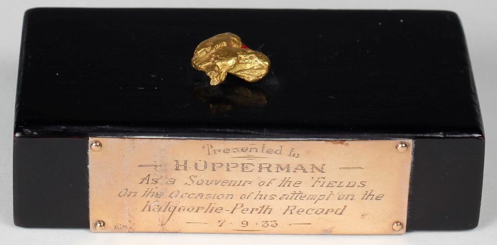 This souvenir gold nugget was presented to Hubert Opperman, on behalf of the people of Kalgoorlie, by the Mayor of Kalgoorlie, Mr E. E. Brimage. Its presentation was made at the Kalgoorlie Town Hall on the eve of Opperman's attempt on the Kalgoorlie to Perth record, in the anticipation of a record-breaking result.