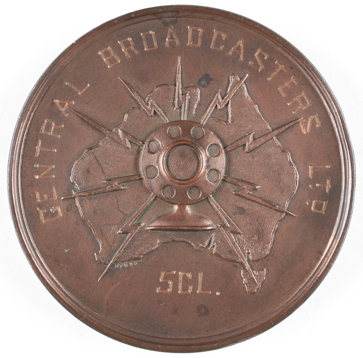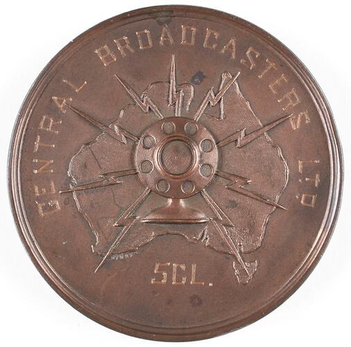 Round bronze inscribed medal with image of map of Australia with a broadcasting speaker on the obverse. Image of laurel wreath on reverse.