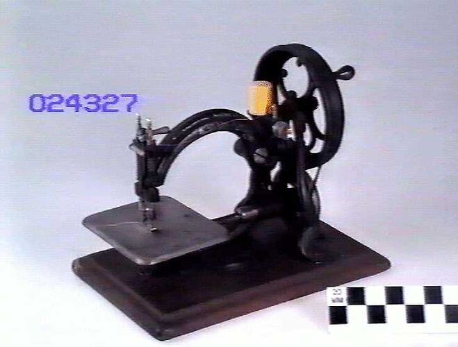 Chain Stitch sewing machine made by Wilcox & Gibbs Sewing Machine Co. post 1864. The latest patent for this machine is for 1864. The simple chain or tambour stitch machine was invented in 1856 by James A.E. Gibbs of Virginia. It was later improved by J. Wilcox and manufactured using the combined patents.