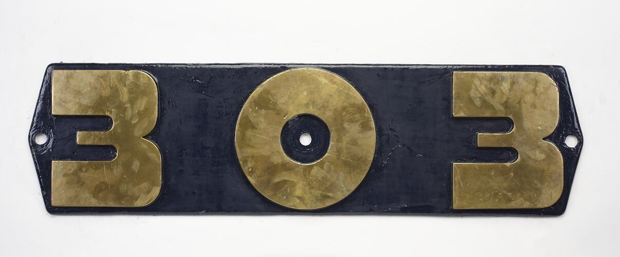 Locomotive number plate S Class, number 303, from a Victorian Railways, express passenger steam locomotive, 4-6-2. The S class was built at the Newport Workshops of Victorian Railways, 1928