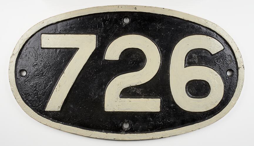 Locomotive number plate, No 726, from South Australian Railways 720 class steam locomotive, 2-8-4, manufactured Islington Workshops, South Australia, 1938, and operated by South Australian Railways, 1938-1960.
