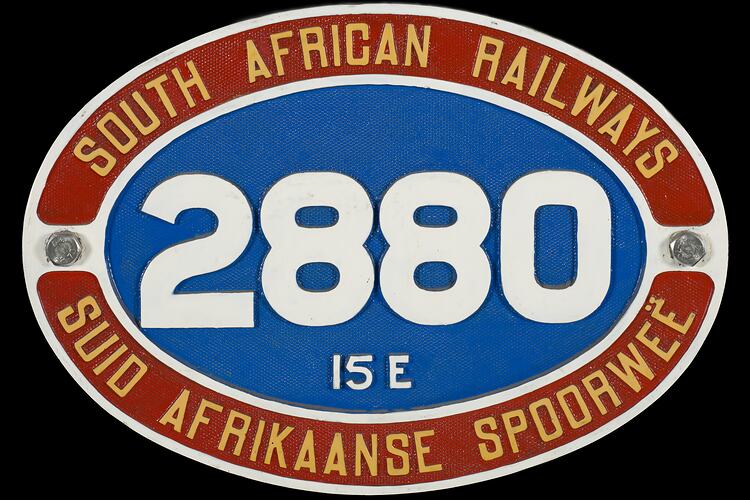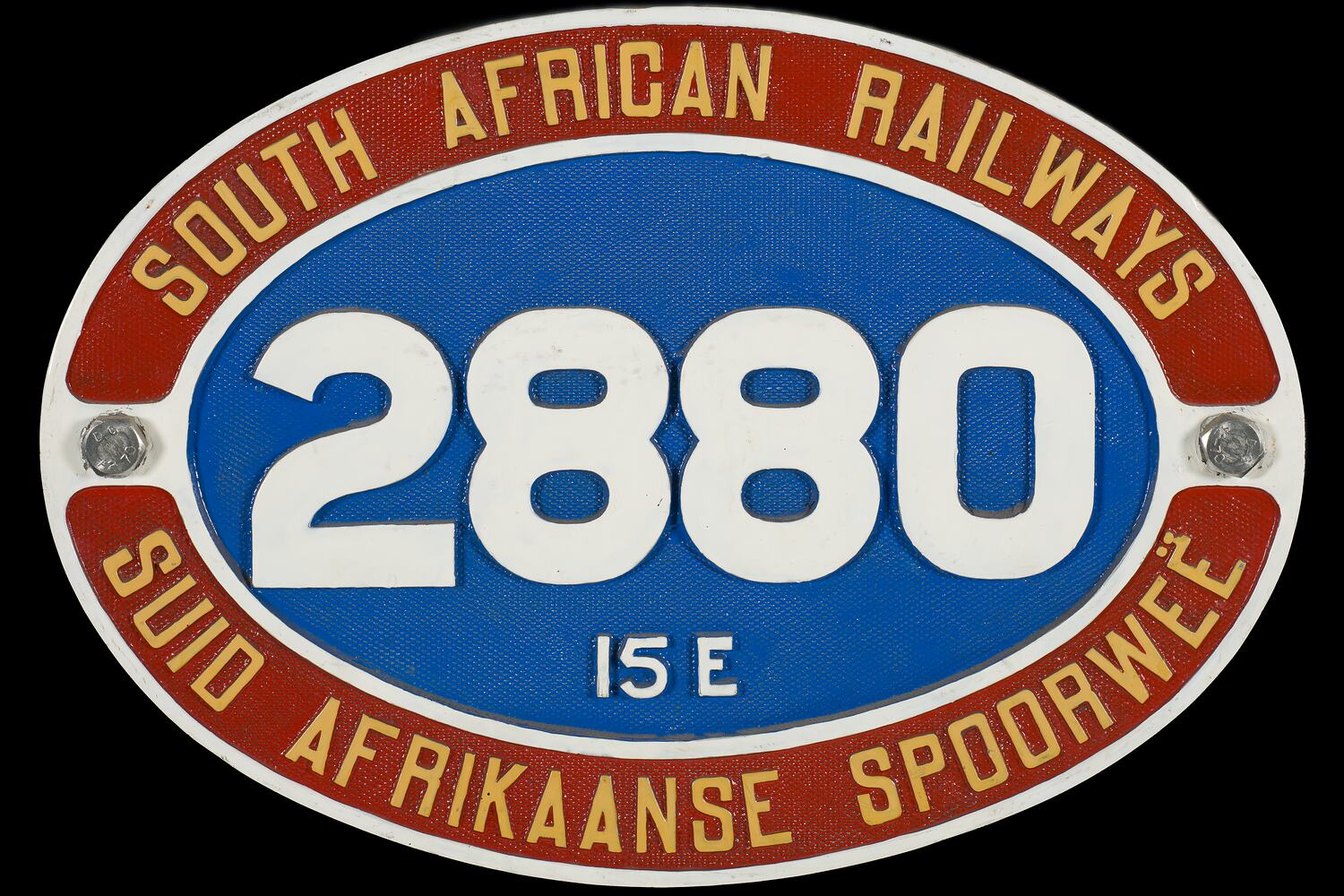 Locomotive number plate 15E series, number 2880, from a South African Railways, 4-8-2 steam locomotive, fitted with Caprotti poppet valve gear. This locomotive was built by Henschel & Sohn, Kassel, Germany, 1936.