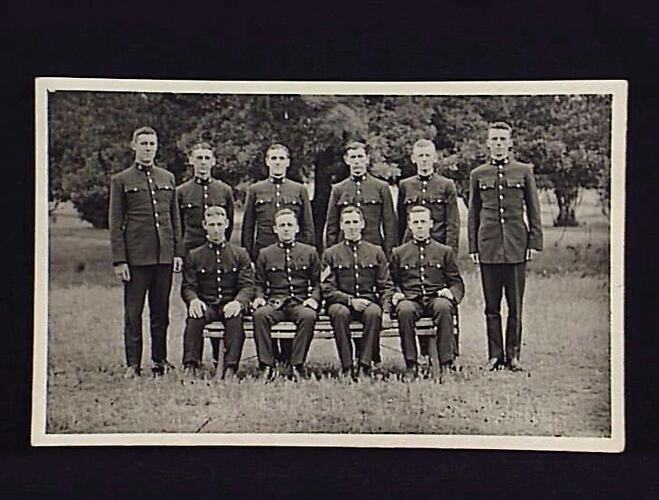 Group portrait of 10 graduates & army cadets at Royal Military College, Duntroon. Old Ballarat High School students are depicted. The photograph was taken in November 1914.