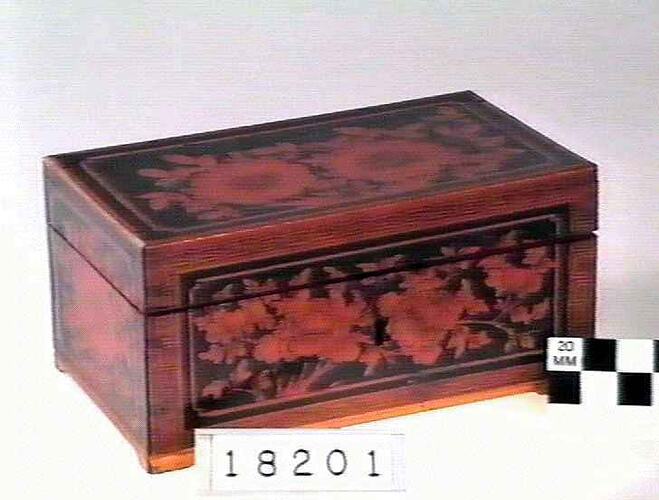 Small, rectangular, wooden box, stenciled all over with a floral design. Hinged lid.