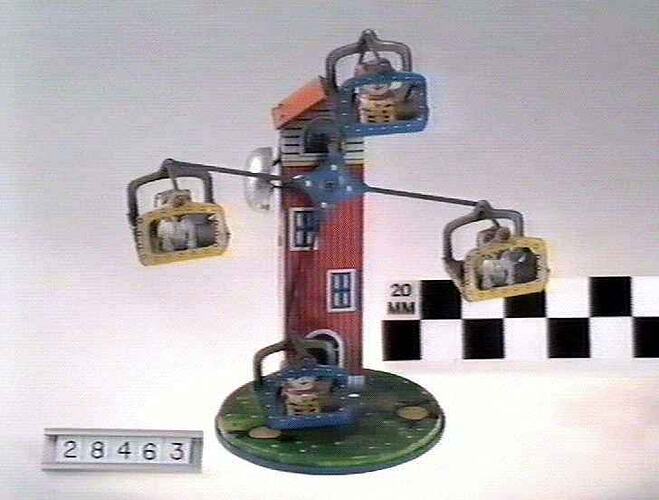 Tin-plate toy ferris wheel consisting of a sentry box with four rotating arms, each terminating in a box cage containing a cat. It is clockwork driven.