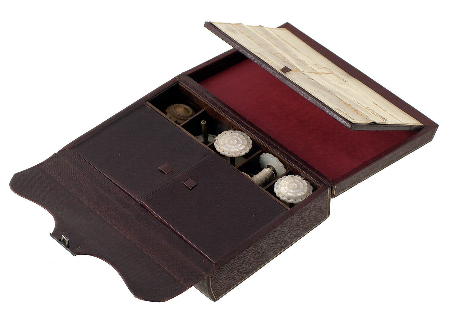 Sewing kit in leather box. It is part of a collection of items which include three visiting card cases, baby's rattle and teething ring, rule, skittle game, box of needles, blotter folder, pencil leads, and carved ivory pen.