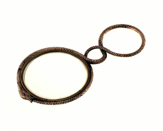 Single eye glass with a gold coloured metal frame, in the shape of a snake, which has been twisted aound to form a handle.