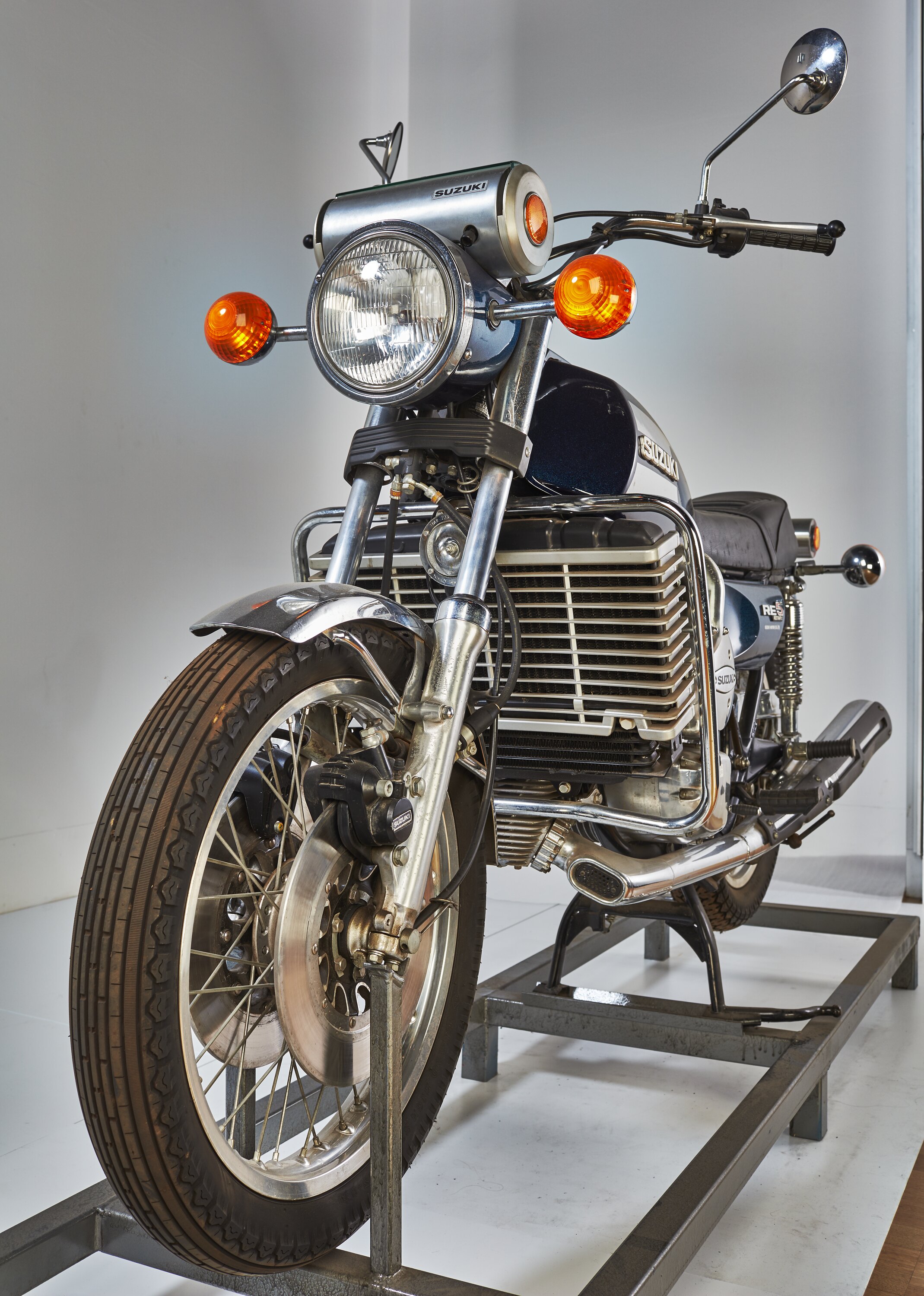 The Museum purchased this example of the Suzuki RE5 from the Melbourne Motor Cycle Company Pty Ltd in South Melbourne in 1977, shortly after production ceased. It features the original 'space-age' circular 'Nippon Seiki' instrument cluster indicating it is a pre-1976 model which reverted to conventional round instruments. It has dual disc brakes on the front wheel and drum brakes on the rear wheel.