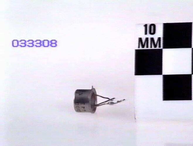 Small tin-plated metal can (T05 case). Three wires protruding from body of casing. Device was removed (unsoldered) from circuit.