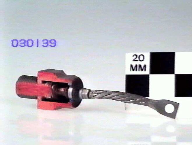 Stud mounted metal body with heavy duty braid anode connection. Sectioned for display purposes.
