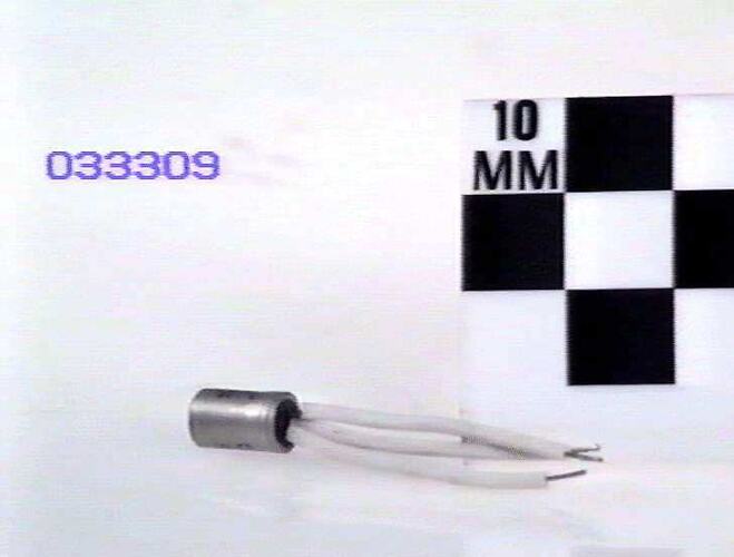 Small aluminium cylindrical case. Three wires protruding from one end. White plastic sleeving on wires.