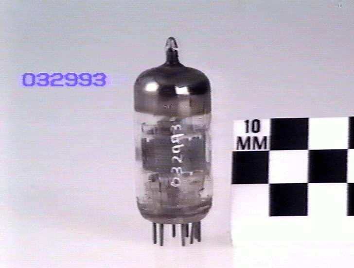 Tubular glass bulb with exhaust tip on top with ten pin miniature configuration.