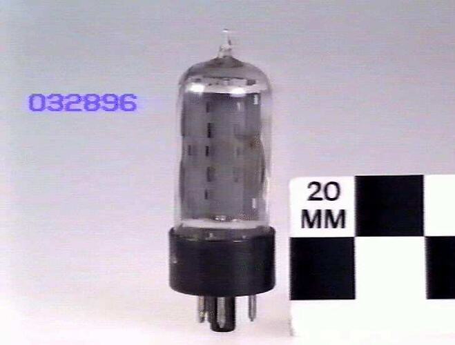 Tubular glass bulb with top exhaust tip on octal base with 5 pins present.