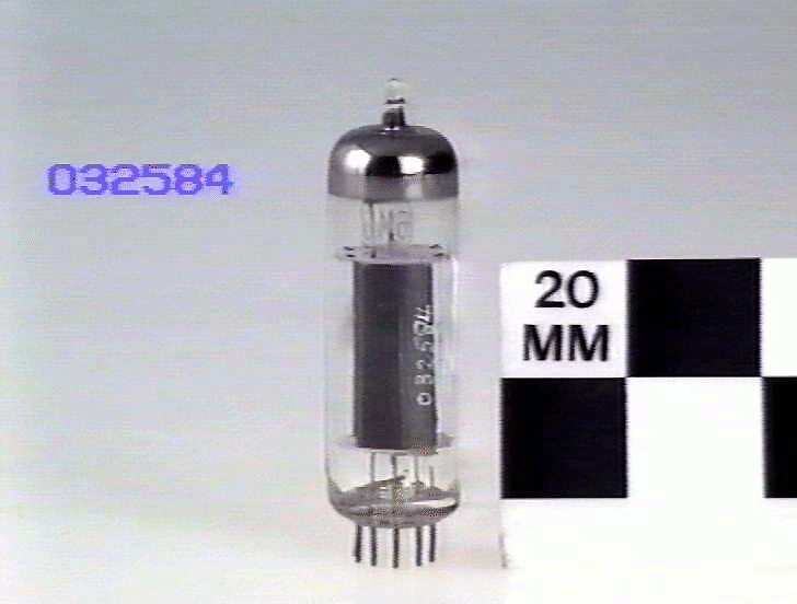 Tubular glass bulb with exhaust tip and nine pin miniature base.