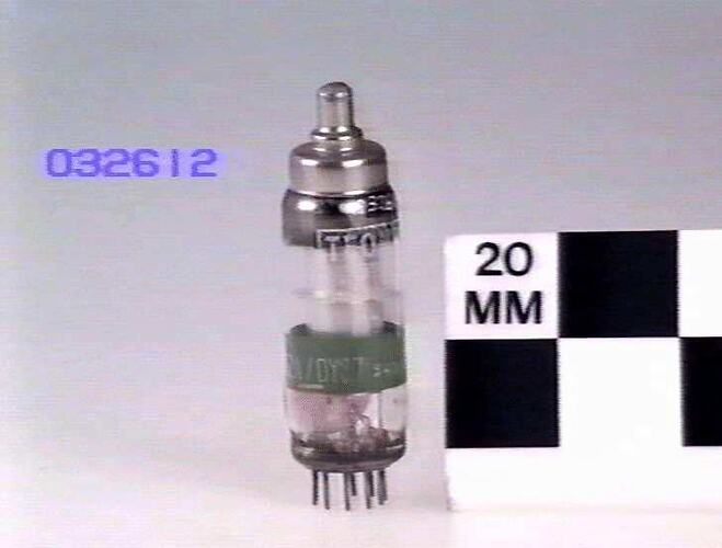 Tubular glass bulb with flanged top cap and nine pin miniature base.