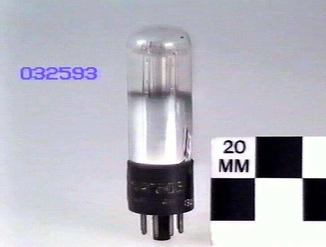 Tubular glass bulb on octal base (seven pins present).