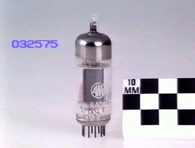6.3 volt indirectly heated cathode, manufactured by AWV, Sydney, Australia, 1960-1970. Dual pentode with common cathode, grid 1 and grid 2. Designed for use as a combined synchronising pulse separator, noise limiter and AGC valve in television receivers.