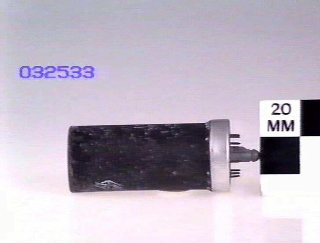 Cylindrical metal can with 9 pin lock-in base.Can is painted black with corrosion showing through the paint.