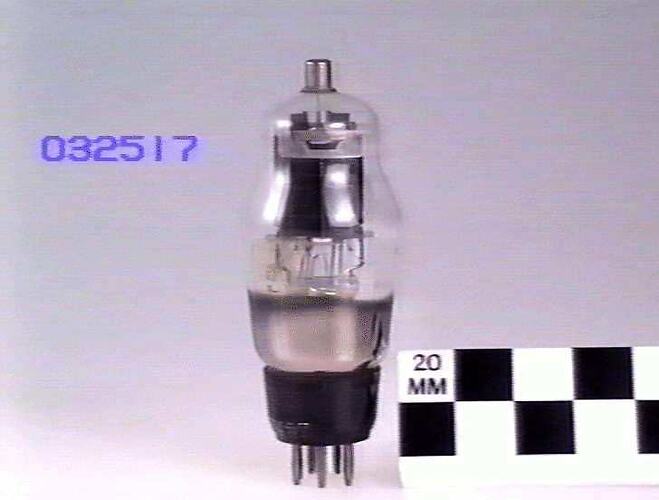 Large shouldered glass bulb with top cap and seven pin British style base.
