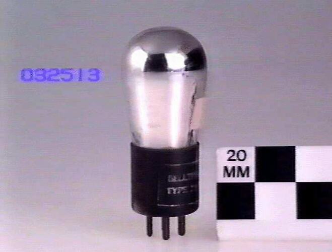 Handwritten sticker on bulb: 32-48 10/6/46 On base (rubber stamp): BELLTRON TYPE 201-A Moulded into the underside of the base: A star between the two thicker pins and the image of a wasp or bee in the centre.