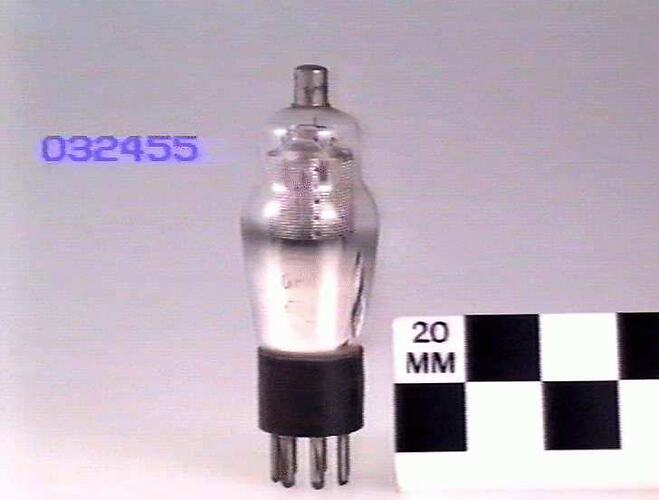 6.3 volt indirectly heated cathode, manufactured by RCA, Harrison, NJ, USA. Triode- pentode type 6F7, the triode and pentode sections share a common cathode. The triode could be used as an amplifier, a detector or an oscillator; the pentode section could be used as an RF or audio amplifier or as a frequency changer.