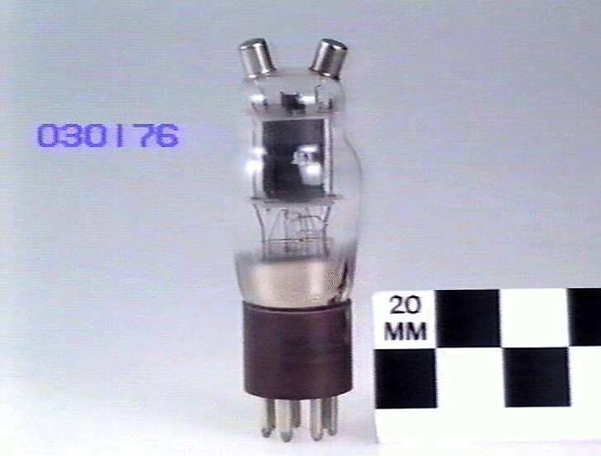 Twin triode designed for use as a power amplifier, frequency multiplier or oscillator. Each plate is brought out to a top cap to minimise lead inductance. The valve could be operated at maximum ratings up to 80 MHz and at reduced ratings up to 160 MHz. Also known as RK-34