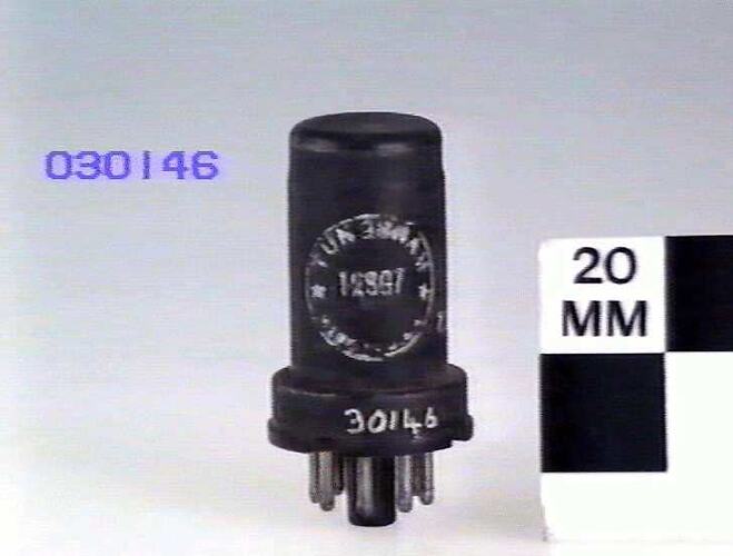 12.6 volt indirectly heated cathode at 150mA; mutuak conductance 4700. 6SG7 is 6V version. Semi remote cut-off pentode used as an RF or IF amplifier in radio receivers. Manufactured for Tungsram Radio Works Ltd., London, England, 1945-1955. Many American type valves such as this one were imported into England and rebranded by their importers in the post war years for replacement purposes.