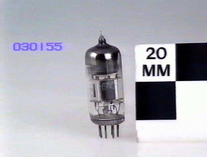 6AG5 pentode. Miniature sharp cut-off pentode mainly used as an RF or IF amplifier in radar and television receivers. Useful up to 400 MHz. 6.3 volt indirectly heated cathode at 300 ma, similar to 6BC5, manufactured by RCA, Harrison, NJ, USA, 1942-1960.