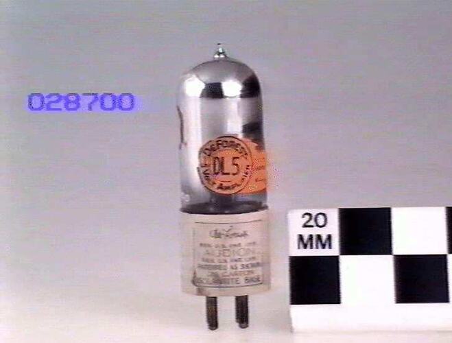 The tube used for detection and amplification in accumulator (rechargeable) powered radio receivers, made by De Forest In America, circa 1926.