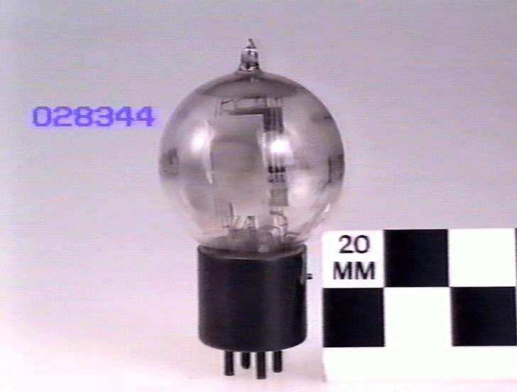Spherical bulb (with evacuation tip) on 4 pin UY style base. The bayonet pin is rotated 45° from the normal position to prevent lower power valves from being pugged into sockets designed for this type. Internal glass arbour is broken.