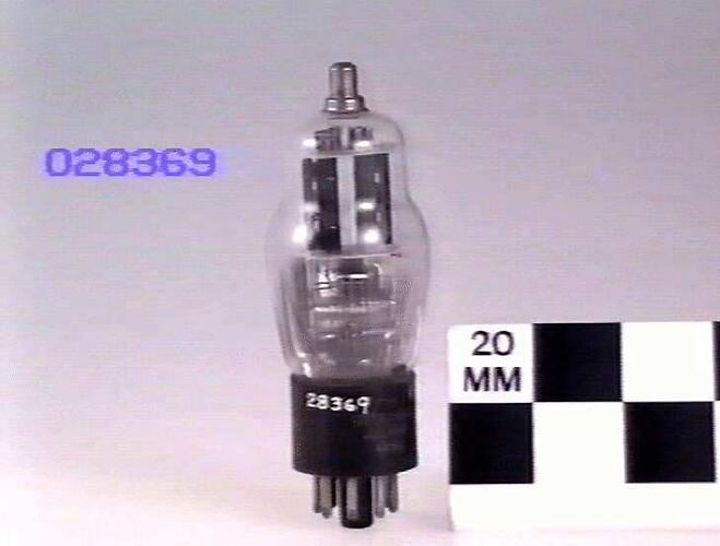 This valve contains two identical independent medium mu triode units in the one bulb. Mainly used for audio amplification (Class A amplifier). The base notice about replacement use only suggests production during World War II (1939-1945).