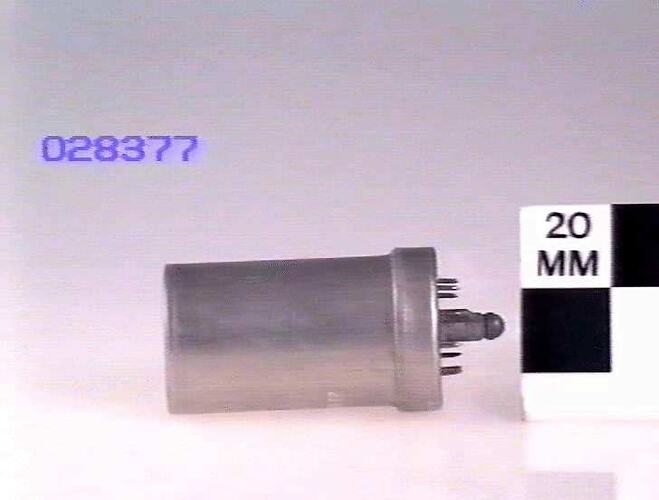 Cylindrical metal covered bulb with nine pin lock-in base.