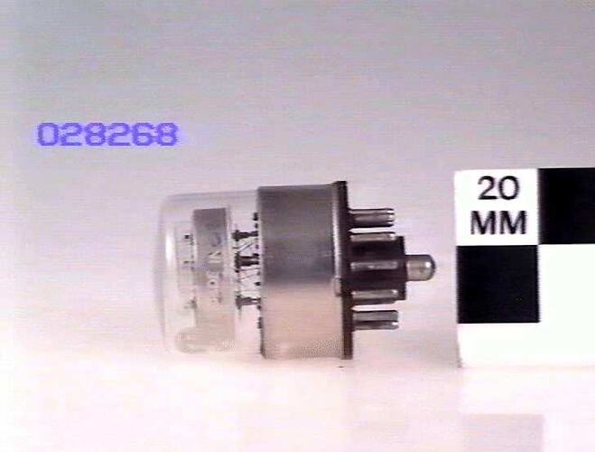 A cold cathode decade counter tube, manufactured by Standard Telephones and Cables, England, introduced in the late 1950s or 1960s and used as in electronic counters.