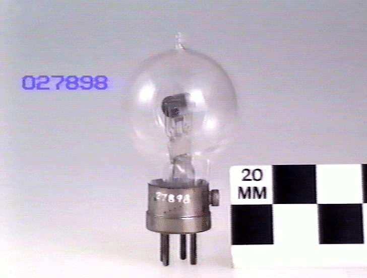 Spherical bulb with exhaust tip on top. 4 pin European style base with side terminal.