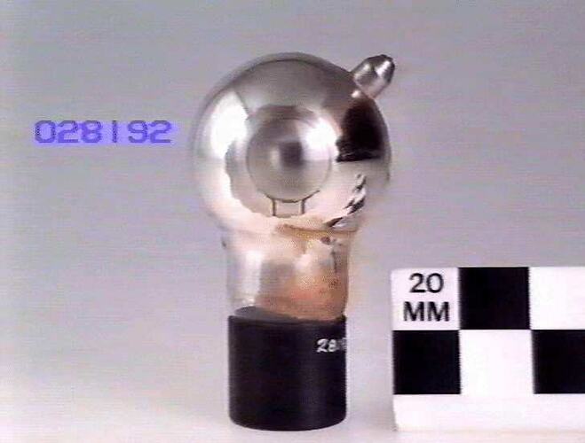 Consists of round silver coloured bulb, internally coated (probably with caesium) with clear glass "lens". Topcap on angle. Valve base with no pins on bulb neck. Bulb diameter is 5.5 cm. Anode is ring construction.