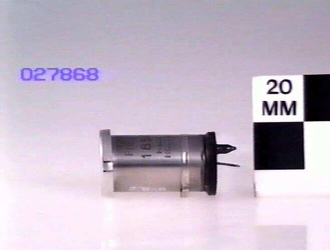 Metal cylinder open at one end with a loose cover. Remnants of widow are visible. The other end has exhaust tip and a wire pin connected to electrode inside.