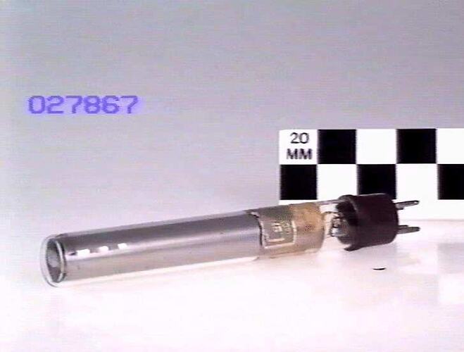 Geiger-Muller tube, a gas filled cold cathode diode. It is operated at a voltage just below the breakdown voltage so that any ionising particle will trigger breakdown, which is detected and extinguished by the attached electronic circuitry. Operates at 380 Volts.