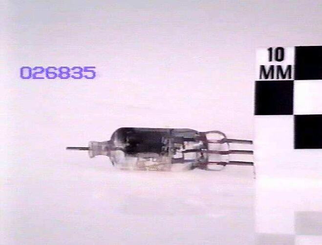 Small tubular glass bulb with 3 pins in line at one end and a single pin at the other.