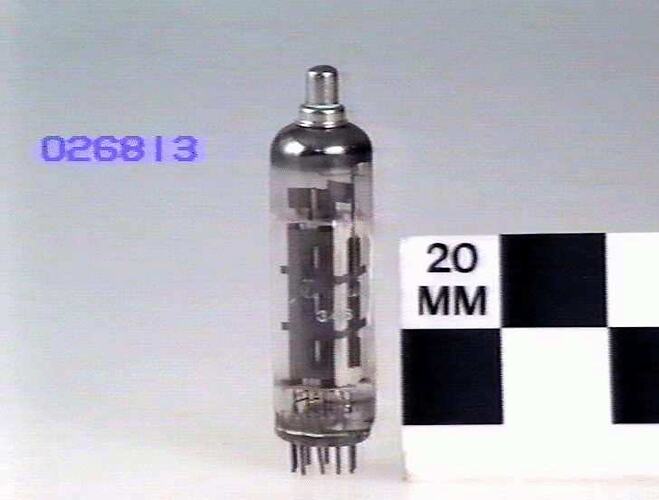 Tubular glass bulb on nine pin miniature glass button base with top cap. Valve is contained in rectangular yellow and blue coloured cardboard box with fixed internal cardboard packing.