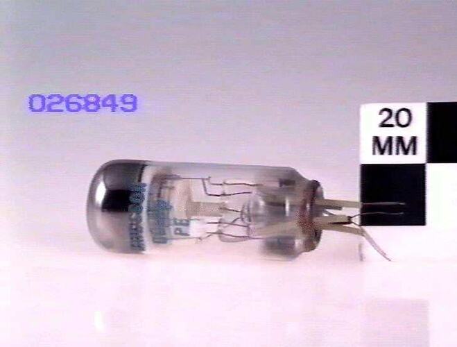 These tubes were designed to be viewed through the top of the bulb where a neon glow around one of the 10 cathodes would indicate the count held in it. Maximum counting rate was 4000 per second. Used in counters and timers in the 1950s and early 1960s.
